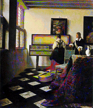 This painting, "The Music Lesson," c.1662-65 (minus the added colors, of course), is one of the 35 or so that Vermeer filled with his serene yet dramatic light. Seeing the recent collection, I noticed that his light so radiates drama because it does not fade gradually but seems to depict the sharper contrast of a photograph. Look at the abrupt change from sun to shadow on the left wall. A painting done from a photograph has this aspect because film conveys light much less subtlely than the eye. I wondered how Vermeer could have seen a photograph.